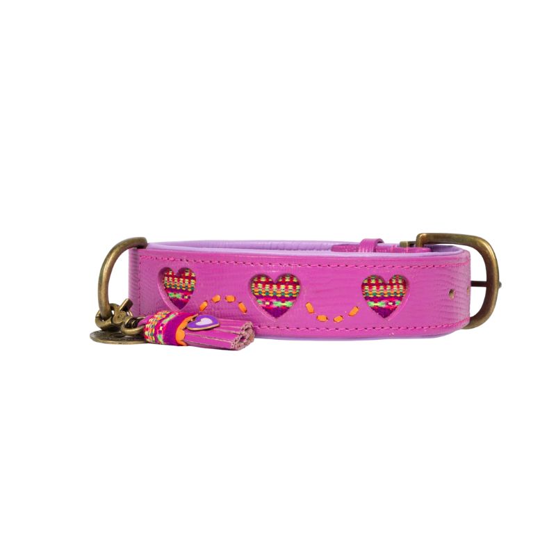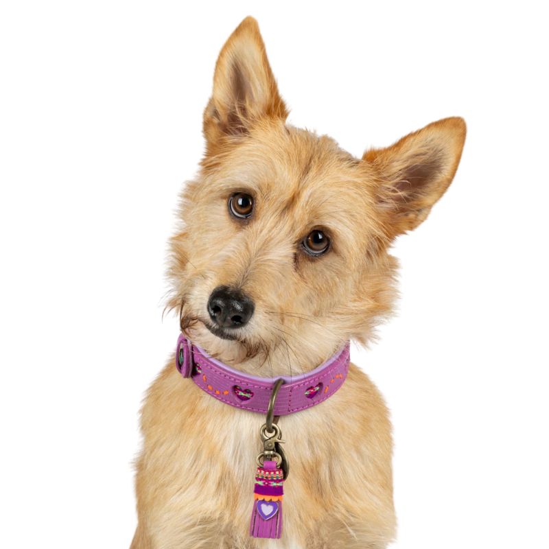 Das Halsband SPICE ist aus Leder gefertigt und ist mit seinen violetten Herzchen ein echter Hingucker für jeden Spaziergang.